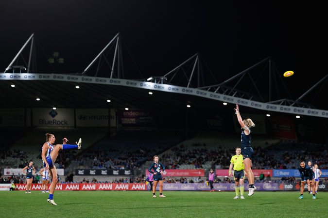 MELBOURNE, AUSTRALIA - SEPTEMBER 25: Lulu Pullar of the Kangaroos celebrates a goal during the 2024 AFLW Round 05 match between the Carlton Blues and the North Melbourne Tasmanian Kangaroos at IKON Park on September 25, 2024 in Melbourne, Australia. (Photo by Dylan Burns/AFL Photos)