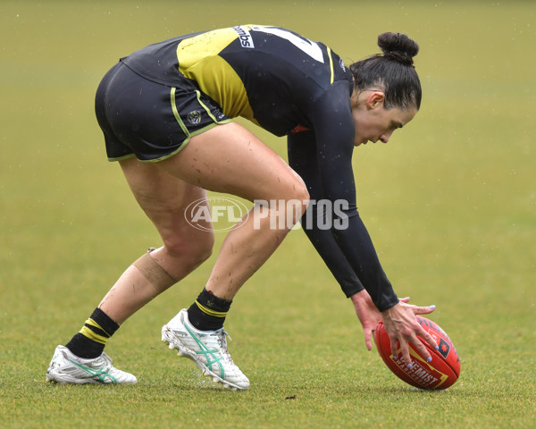 LAUNCESTON, AUSTRALIA - SEPTEMBER 29: Tessa Lavey of the Tigers gathers the ball during the round five AFLW match between North Melbourne Kangaroos and Richmond Tigers at University of Tasmania Stadium, on September 29, 2024, in Launceston, Australia. (Photo by Simon Sturzaker/Getty Images via AFL Photos)