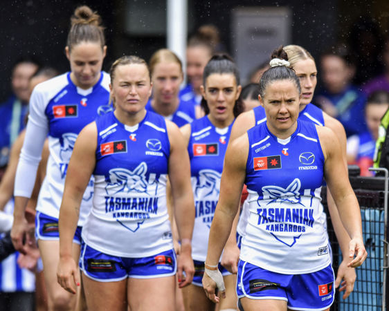 LAUNCESTON, AUSTRALIA - SEPTEMBER 29: Emma Kearney of the Kangaroos and Tessa Lavey of the Tigers contest the coin toss during the round five AFLW match between North Melbourne Kangaroos and Richmond Tigers at University of Tasmania Stadium, on September 29, 2024, in Launceston, Australia. (Photo by Steve Bell/AFL Photos)