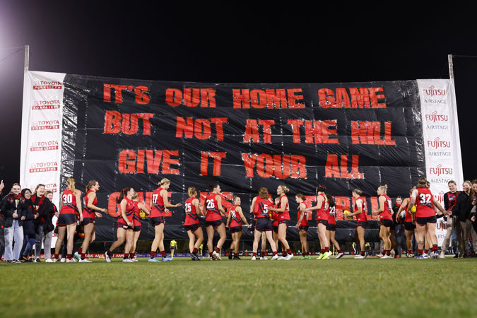 MELBOURNE, AUSTRALIA - OCTOBER 02: The Bombers run thru their banner during the 2024 AFLW Round 06 match between the Essendon Bombers and the Sydney Swans at Mission Whitten Oval on October 02, 2024 in Melbourne, Australia. (Photo by Michael Willson/AFL Photos)