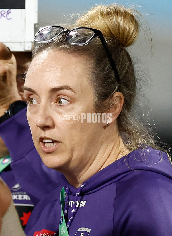GEELONG, AUSTRALIA - OCTOBER 01: Lisa Webb, Senior Coach of the Dockers addresses their players during the 2024 AFLW Round 06 match between the Geelong Cats and the Fremantle Dockers at GMHBA Stadium on October 01, 2024 in Geelong, Australia. (Photo by Michael Willson/AFL Photos)