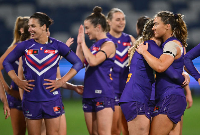 GEELONG, AUSTRALIA - OCTOBER 01: Fremantle players celebrate winning the round six AFLW match between Geelong Cats and Fremantle Dockers at GMHBA Stadium, on October 01, 2024, in Geelong, Australia. (Photo by Quinn Rooney/Getty Images via AFL Photos)