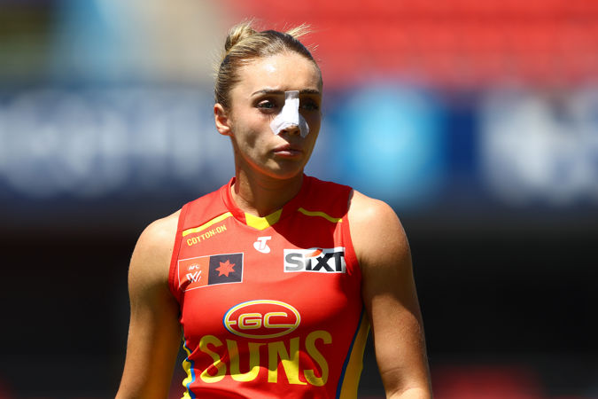 GOLD COAST, AUSTRALIA - OCTOBER 06: Chloe Adams of the Bombers kicks during the round six AFLW match between Gold Coast Suns and Essendon Bombers at People First Stadium, on October 06, 2024, in Gold Coast, Australia. (Photo by Chris Hyde/Getty Images via AFL Photos)
