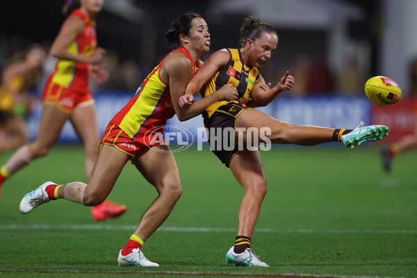 MELBOURNE, AUSTRALIA - OCTOBER 02: Jasmine Fleming of the Hawks kicks the ball whilst being tackled by Lucy Single of the Suns during the round six AFLW match between Hawthorn Hawks and Gold Coast Suns at Kinetic Stadium, on October 02, 2024, in Melbourne, Australia. (Photo by Daniel Pockett/Getty Images via AFL Photos)