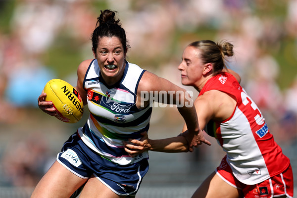 SYDNEY, AUSTRALIA - OCTOBER 06: Jacqueline Parry of the Cats controls the ball during the round six AFLW match between Sydney Swans and Geelong Cats at Henson Park, on October 06, 2024, in Sydney, Australia. (Photo by Brendon Thorne/AFL Photos)