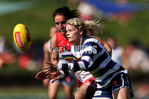 SYDNEY, AUSTRALIA - OCTOBER 06: Georgie Prespakis of the Cats controls the ball during the round six AFLW match between Sydney Swans and Geelong Cats at Henson Park, on October 06, 2024, in Sydney, Australia. (Photo by Brendon Thorne/AFL Photos)