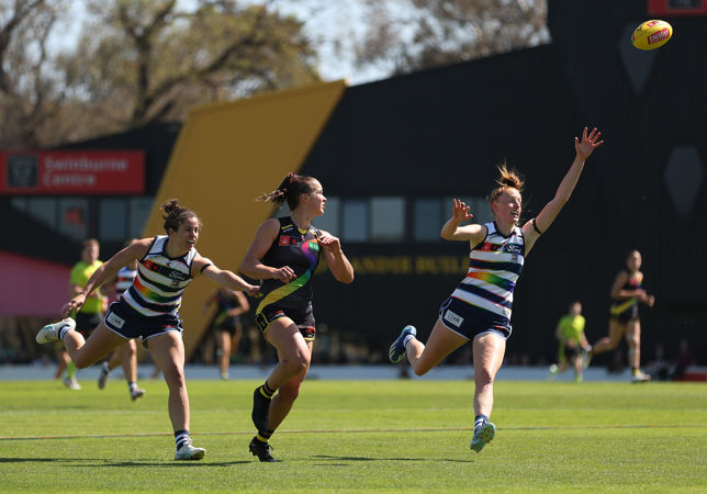 MELBOURNE, AUSTRALIA - OCTOBER 12: Georgie Prespakis of the Cats controls the ball during the round seven AFLW match between Richmond Tigers and Geelong Cats at Swinburne Centre, on October 12, 2024, in Melbourne, Australia. (Photo by Robert Cianflone/Getty Images via AFL Photos)