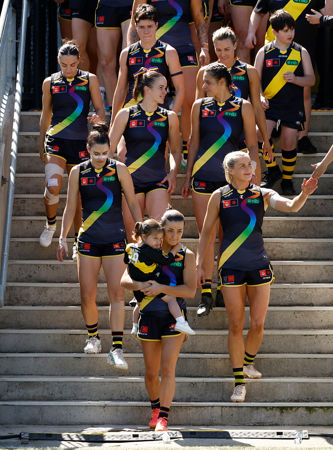 MELBOURNE, AUSTRALIA - OCTOBER 12: Kate Dempsey of the Tigers and daughter Pippa are seen during the 2024 AFLW Round 07 match between the Richmond Tigers and the Geelong Cats at Swinburne Centre on October 12, 2024 in Melbourne, Australia. (Photo by Michael Willson/AFL Photos)