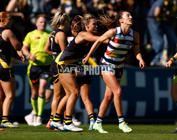 MELBOURNE, AUSTRALIA - OCTOBER 12: Players wrestle at the three quarter time break during the 2024 AFLW Round 07 match between the Richmond Tigers and the Geelong Cats at Swinburne Centre on October 12, 2024 in Melbourne, Australia. (Photo by Michael Willson/AFL Photos)