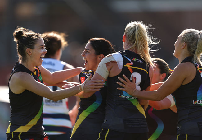 MELBOURNE, AUSTRALIA - OCTOBER 12: Katie Brennan, Captain of the Tigers celebrates after scoring a goal during the round sevat Ryanen AFLW match between Richmond Tigers and Geelong Cats at Swinburne Centre, on October 12, 2024, in Melbourne, Australia. (Photo by Robert Cianflone/Getty Images via AFL Photos)