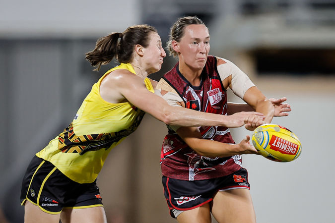 DARWIN, AUSTRALIA - OCTOBER 26: Monique Conti of the Tigers handpasses the ball during the 2024 AFLW Round 09 match between the Essendon Bombers and the Richmond Tigers at TIO Stadium on October 26, 2024 in Darwin, Australia. (Photo by Dylan Burns/AFL Photos)