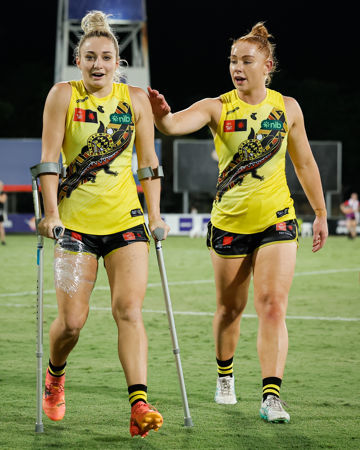 DARWIN, AUSTRALIA - OCTOBER 26: The Bombers leave the field after the game ended in a draw during the 2024 AFLW Round 09 match between the Essendon Bombers and the Richmond Tigers at TIO Stadium on October 26, 2024 in Darwin, Australia. (Photo by Dylan Burns/AFL Photos)