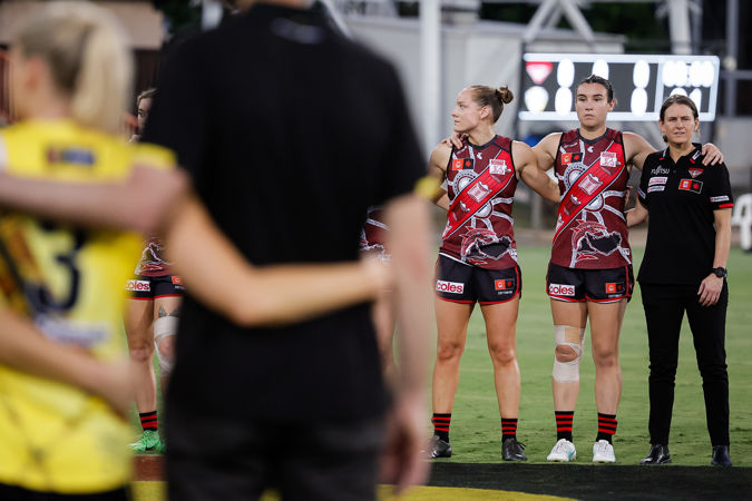 DARWIN, AUSTRALIA - OCTOBER 26: General scenes during the prematch ceremony during the 2024 AFLW Round 09 match between the Essendon Bombers and the Richmond Tigers at TIO Stadium on October 26, 2024 in Darwin, Australia. (Photo by Dylan Burns/AFL Photos)