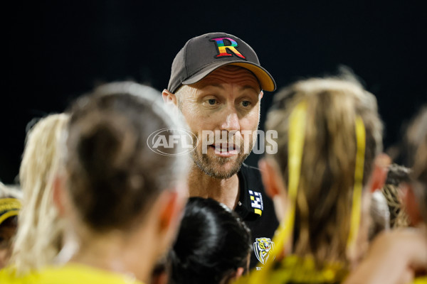 DARWIN, AUSTRALIA - OCTOBER 26: Ryan Ferguson, Senior Coach of the Tigers addresses his players during the 2024 AFLW Round 09 match between the Essendon Bombers and the Richmond Tigers at TIO Stadium on October 26, 2024 in Darwin, Australia. (Photo by Dylan Burns/AFL Photos)