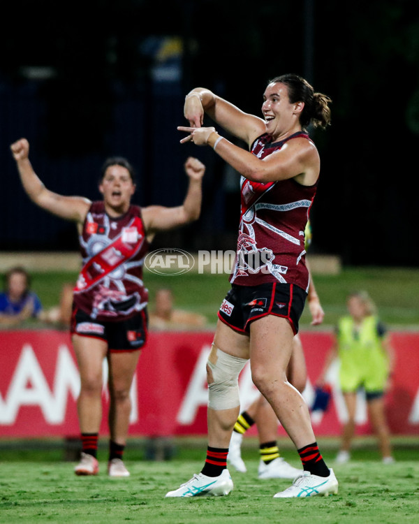 DARWIN, AUSTRALIA - OCTOBER 26: Bonnie Toogood, Co-Captain of the Bombers celebrates a goal during the 2024 AFLW Round 09 match between the Essendon Bombers and the Richmond Tigers at TIO Stadium on October 26, 2024 in Darwin, Australia. (Photo by Celina Whan/AFL Photos)