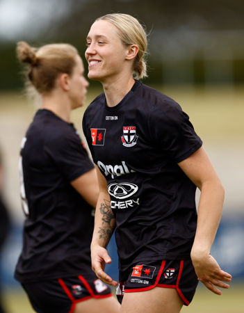 BALLARAT, AUSTRALIA - OCTOBER 27: Alice Edmonds of the Bulldogs warms up during the 2024 AFLW Round 09 match between the Western Bulldogs and Euro-Yroke (the St Kilda Saints) at Mars Stadium on October 27, 2024 in Ballarat, Australia. (Photo by Michael Willson/AFL Photos)