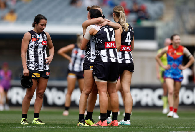 MELBOURNE, AUSTRALIA - NOVEMBER 02: Stacey Livingstone of the Magpies is congratulated after her last match during the 2024 AFLW Round 10 match between Narrm (Melbourne Demons) and the Collingwood Magpies at IKON Park on November 02, 2024 in Melbourne, Australia. (Photo by Michael Willson/AFL Photos)