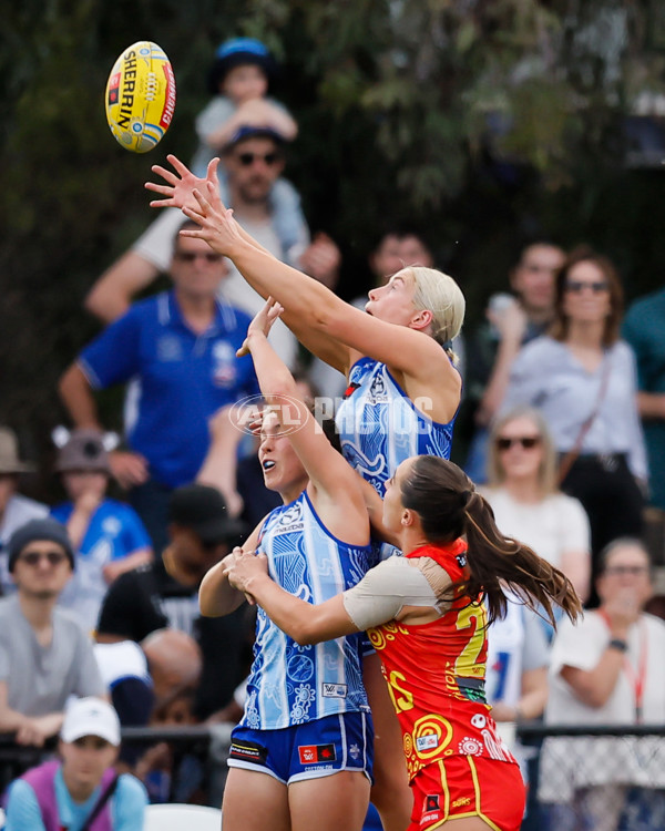 MELBOURNE, AUSTRALIA - NOVEMBER 02: Jasmine Ferguson of the Kangaroos attempts to mark the ball during the 2024 AFLW Round 10 match between the North Melbourne Tasmanian Kangaroos and the Gold Coast Suns at Arden Street Oval on November 02, 2024 in Melbourne, Australia. (Photo by Dylan Burns/AFL Photos)