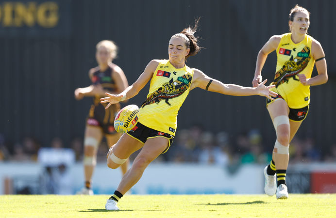 MELBOURNE, AUSTRALIA - NOVEMBER 03: Jodie Hicks of the Tigers is tackled by Jasmine Fleming of the Hawks during the 2024 AFLW Round 10 match between the Richmond Tigers and the Hawthorn Hawks at Swinburne Centre on November 03, 2024 in Melbourne, Australia. (Photo by Michael Willson/AFL Photos)