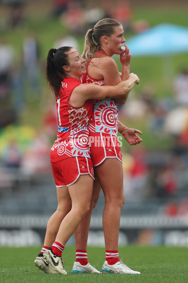 SYDNEY, AUSTRALIA - NOVEMBER 02: Bella R. Smith of the Swans celebrates kicking a goal with Brooke Lochland of the Swans during the round 10 AFLW match between Sydney Swans and West Coast Eagles at Henson Park, on November 02, 2024, in Sydney, Australia. (Photo by Mark Metcalfe/AFL Photos)