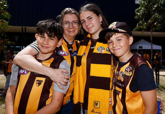 MELBOURNE, AUSTRALIA - NOVEMBER 10: Hawks fans pose during the 2024 AFLW Second Qualifying Final match between the Hawthorn Hawks and the Brisbane Lions at IKON Park on November 10, 2024 in Melbourne, Australia. (Photo by Michael Willson/AFL Photos)