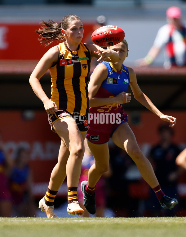 MELBOURNE, AUSTRALIA - NOVEMBER 10: Laura Elliott of the Hawks and Evie Long of the Lions compete for the ball during the 2024 AFLW Second Qualifying Final match between the Hawthorn Hawks and the Brisbane Lions at IKON Park on November 10, 2024 in Melbourne, Australia. (Photo by Michael Willson/AFL Photos)