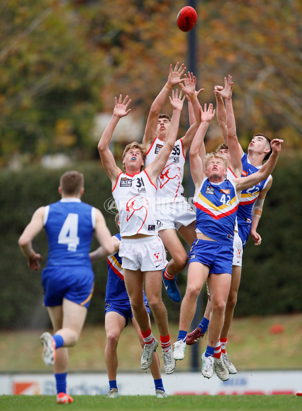 MELBOURNE, AUSTRALIA - MAY 17: Aidan McCartney in action Of the Swans during the 2025 Coates Talent League Boys Round 07 match between Eastern Ranges and Sydney Swans Academy at Box Hill City Oval on May 17, 2025 in Melbourne, Australia. (Photo by Riley Lockett/AFL Photos)