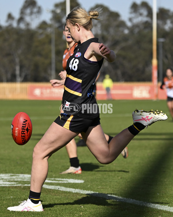 MELBOURNE, AUSTRALIA - JUNE 01: Charlie Gibson of the Bushrangers kicks the ball during the 2025 Coates Talent League Girls Round 08 match between Murray Bushrangers and Northern Territory Academy at La Trobe University on June 01, 2025 in Melbourne, Australia. (Photo by Lachie Chugg/AFL Photos)