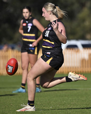 MELBOURNE, AUSTRALIA - JUNE 01: Latoya Holdsworth of the Bushrangers is tackled high during the 2025 Coates Talent League Girls Round 08 match between Murray Bushrangers and Northern Territory Academy at La Trobe University on June 01, 2025 in Melbourne, Australia. (Photo by Lachie Chugg/AFL Photos)