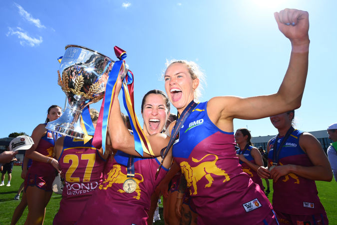 MELBOURNE, AUSTRALIA - DECEMBER 03: The Lions sing the team song during the 2023 AFLW Grand Final match between The North Melbourne Tasmanian Kangaroos and The Brisbane Lions at IKON Park on December 03, 2023 in Melbourne, Australia. (Photo by Dylan Burns/AFL Photos)