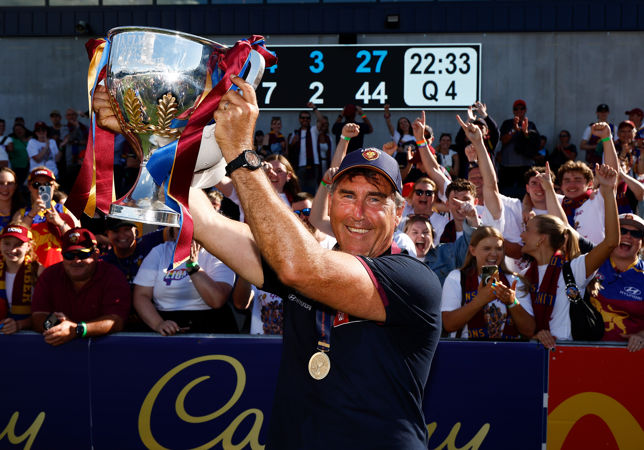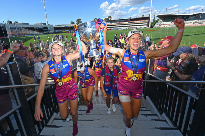 MELBOURNE, AUSTRALIA - DECEMBER 03: Sophie Conway and Ruby Svarc of the Lions celebrate following the AFLW Grand Final match between North Melbourne Tasmania Kangaroos and Brisbane Lions at Ikon Park, on December 03, 2023, in Melbourne, Australia. (Photo by Morgan Hancock/AFL Photos)