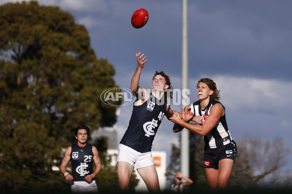 MELBOURNE, AUSTRALIA - JULY 29: Hudson O'Keeffe of the Blues and Aiden Begg of Collingwood contest the ruck during the round 19 VFL match between Collingwood Magpies and Carlton Blues at Victoria Park on July 29, 2023 in Melbourne, Australia. (Photo by Daniel Pockett/AFL Photos)