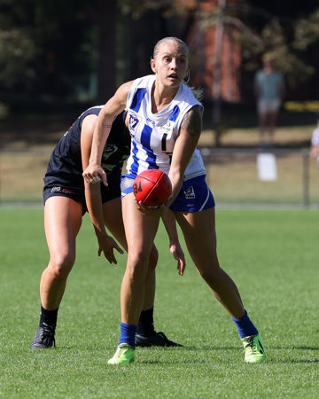 MELBOURNE, AUSTRALIA - APRIL 18: Nyakoat Dojiok and Zoe Savarirayan of the Kangaroos celebrate a goal during the 2025 VFLW Round 01 match between North Melbourne and Carlton at Arden Street Oval on April 18, 2025 in Melbourne, Australia. (Photo by Rob Lawson/AFL Photos)