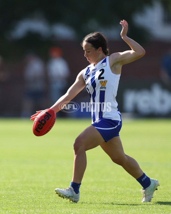MELBOURNE, AUSTRALIA - APRIL 18: Tahlia Meier of the Kangaroos kicks the ball during the 2025 VFLW Round 01 match between North Melbourne and Carlton at Arden Street Oval on April 18, 2025 in Melbourne, Australia. (Photo by Rob Lawson/AFL Photos)