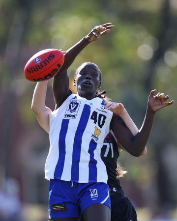 MELBOURNE, AUSTRALIA - APRIL 18: Nyakoat Dojiok of the Kangaroos in action during the 2025 VFLW Round 01 match between North Melbourne and Carlton at Arden Street Oval on April 18, 2025 in Melbourne, Australia. (Photo by Rob Lawson/AFL Photos)